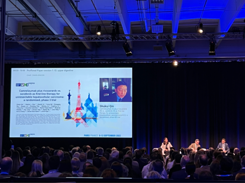 北京时间9月10日,由南京金陵医院秦叔逵教授领衔的一项国家I类新药研究成果“卡瑞利珠单抗联合阿帕替尼一线治疗晚期肝细胞癌的全球多中心、随机对照Ⅲ期研究(SHR-1210-III-310)”,在欧洲肿瘤内科学会(European Society for Medical Oncology,ESMO)年会重磅发布。ESMO年会是欧洲最负盛名和最具影响力的肿瘤学术会议之一。每年ESMO大会上的新研究、新进展都备受全球学者瞩目。经本年度组委会严格筛选和评审,该项研究成果从全球近3400份投稿中脱颖而出,成功入选2022ESMO年会口头报告。